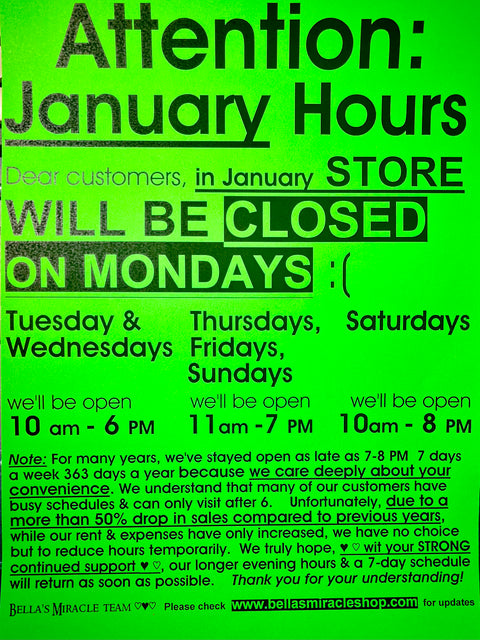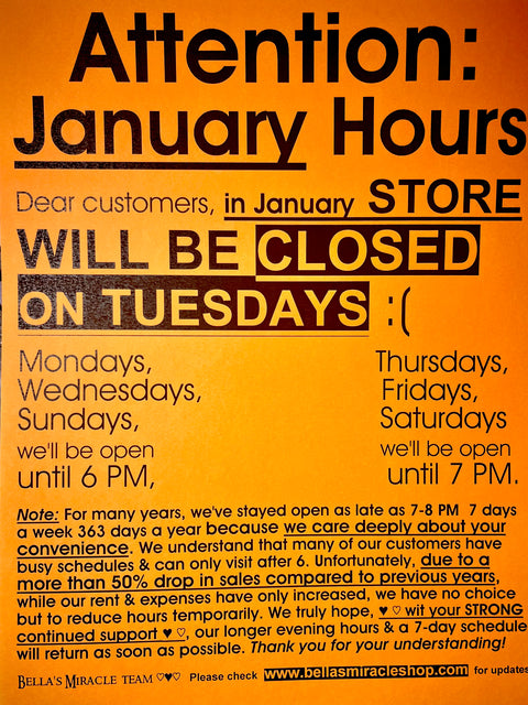 Note: For many years, we've stayed open as late as 7-8 PM 7 days a week 363 days a year because we care deeply about your convenience. We understand that many of our customers have busy schedules & can only visit after 6. Unfortunately, due to a more than 50% drop in sales compared to previous years, while our rent & expenses have only increased, we have no choice but to reduce hours temporarily. We truly hope, ♡ wit your STRONG continued support ♡, our longer evening hours & a 7-day schedule will return as soon as possible. Thank you for your understanding!Bella's Miracle team ♡♡